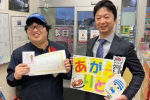 <デザインをした新保スタッフ(Dr.Driveエネオス滑川店社員)と当社社長の島英輔>