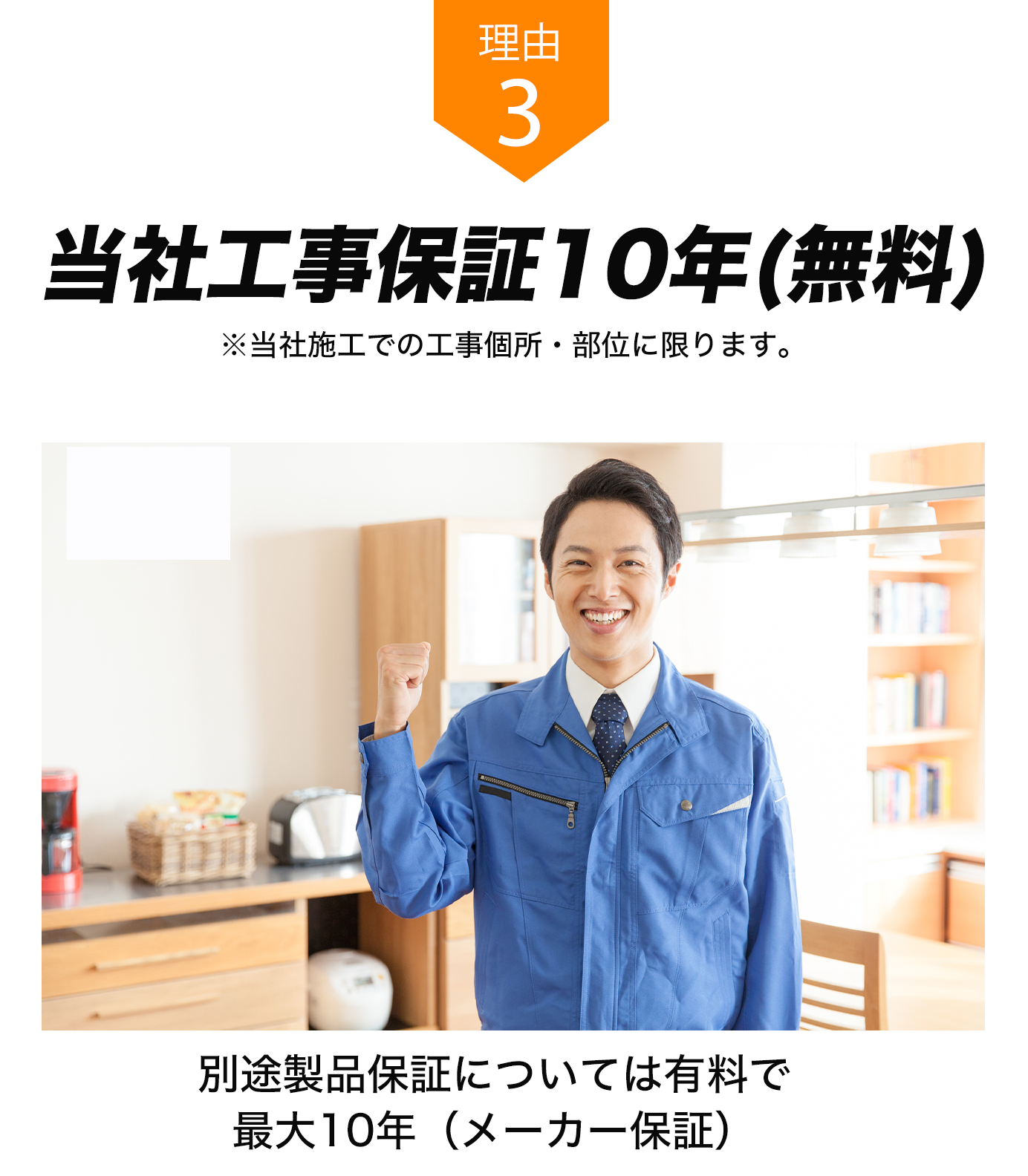 - 一般的にメーカーの無料保証は1~3年程度。有料保証については、最大10年まで保証があります。 別途、工事保証につきましては10年間無料保証とさせていただいております。※ただし、当社施工での工事箇所・部位に限ります。